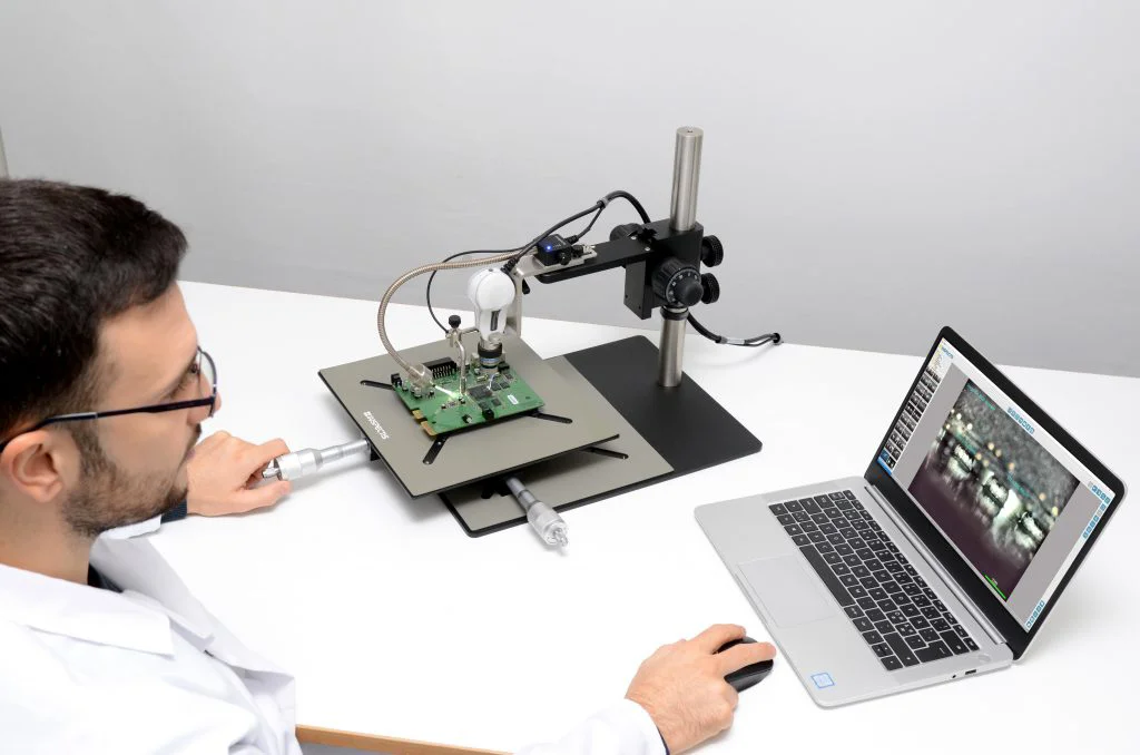 Zum Lieferumfang gehören außerdem eine integrierter Hochleistungsbeleuchtung sowie ein LED-Faserlicht. Es ist auf einem stabilen Stativ montiert und verfügt über einen ESD-sicheren XY-Kreuztisch zur präzisen Positionierung der Baugruppe.