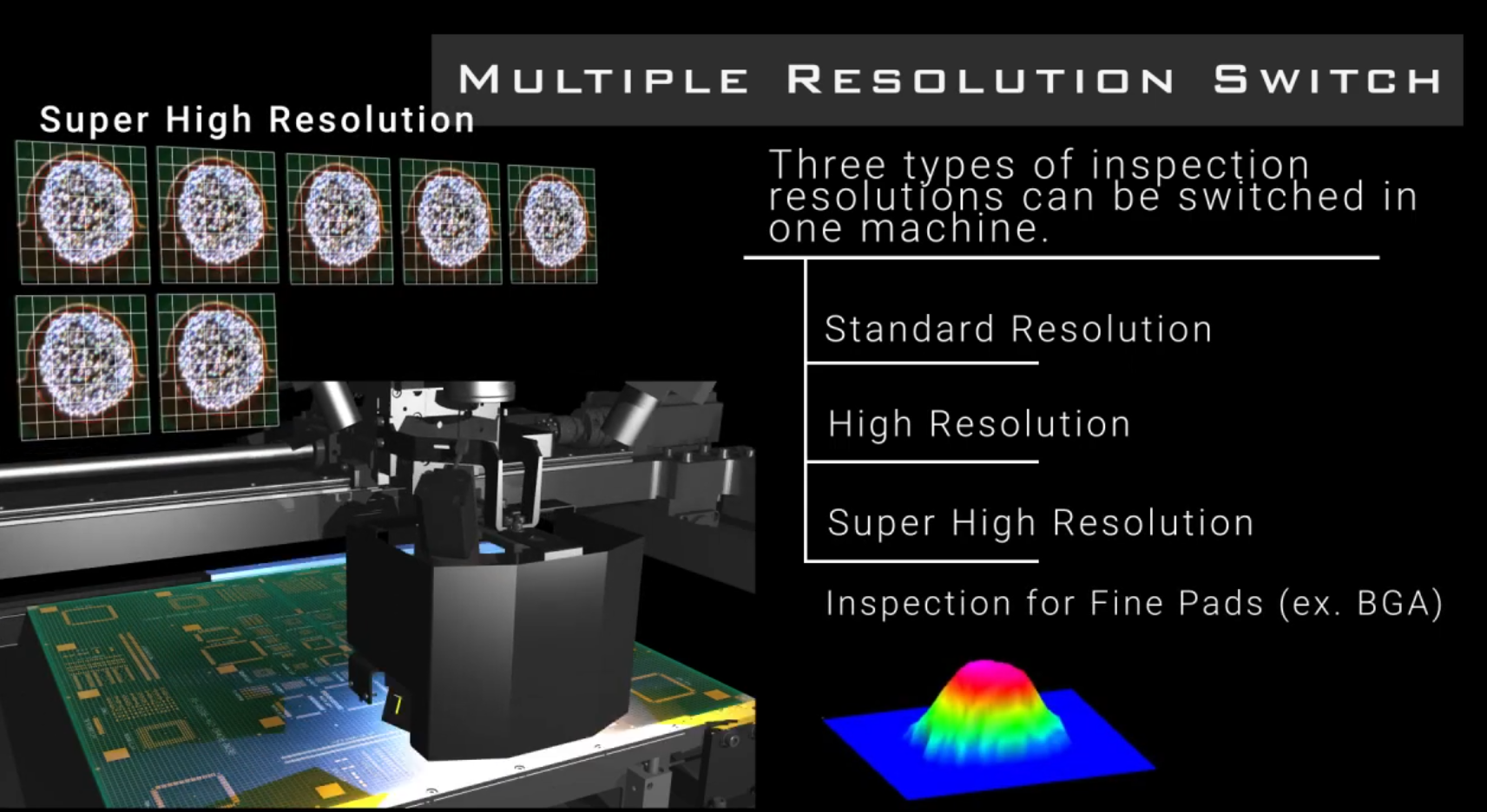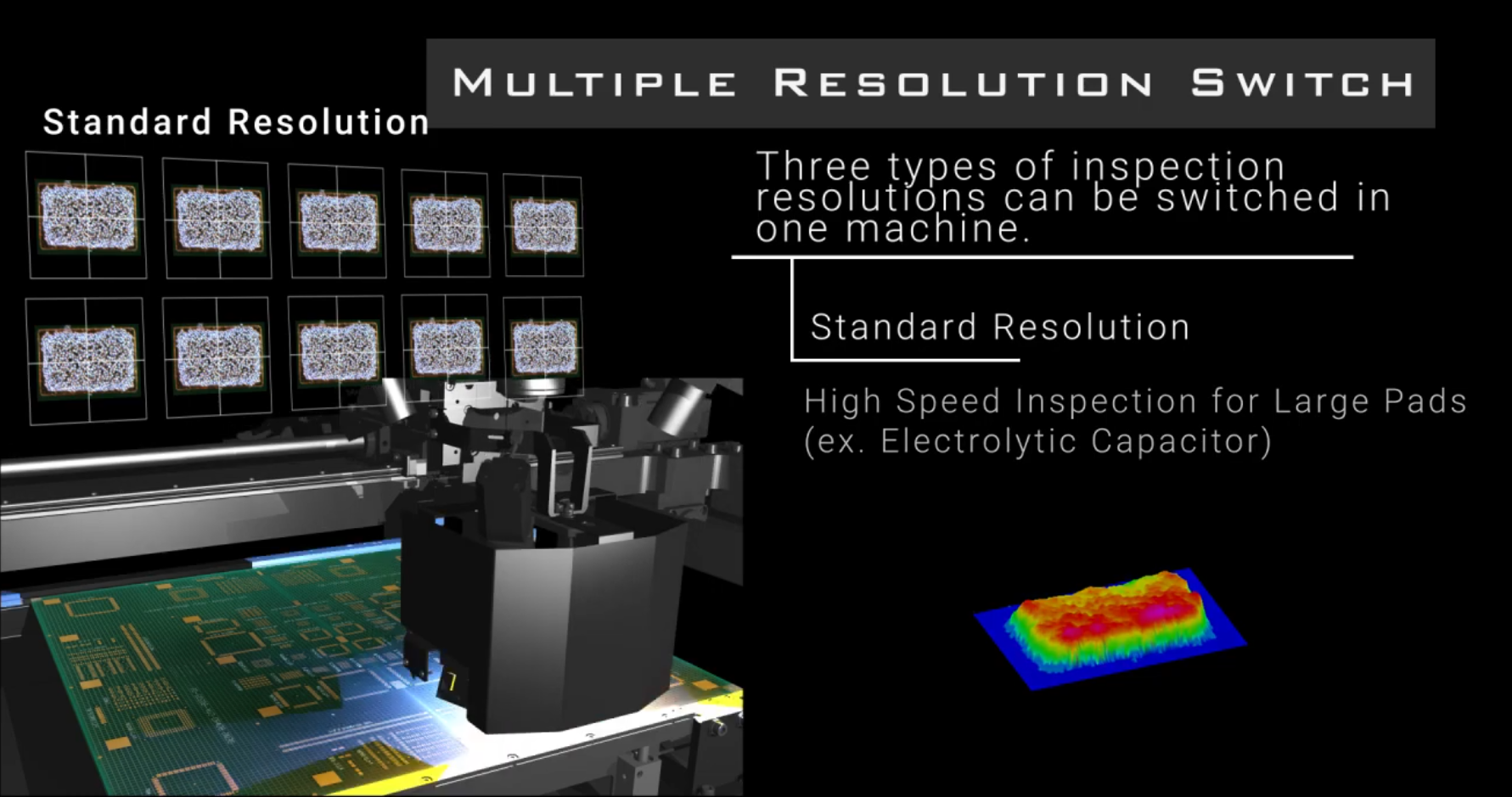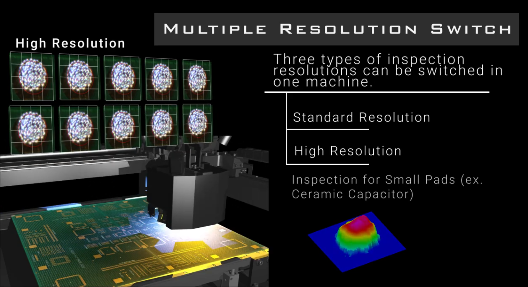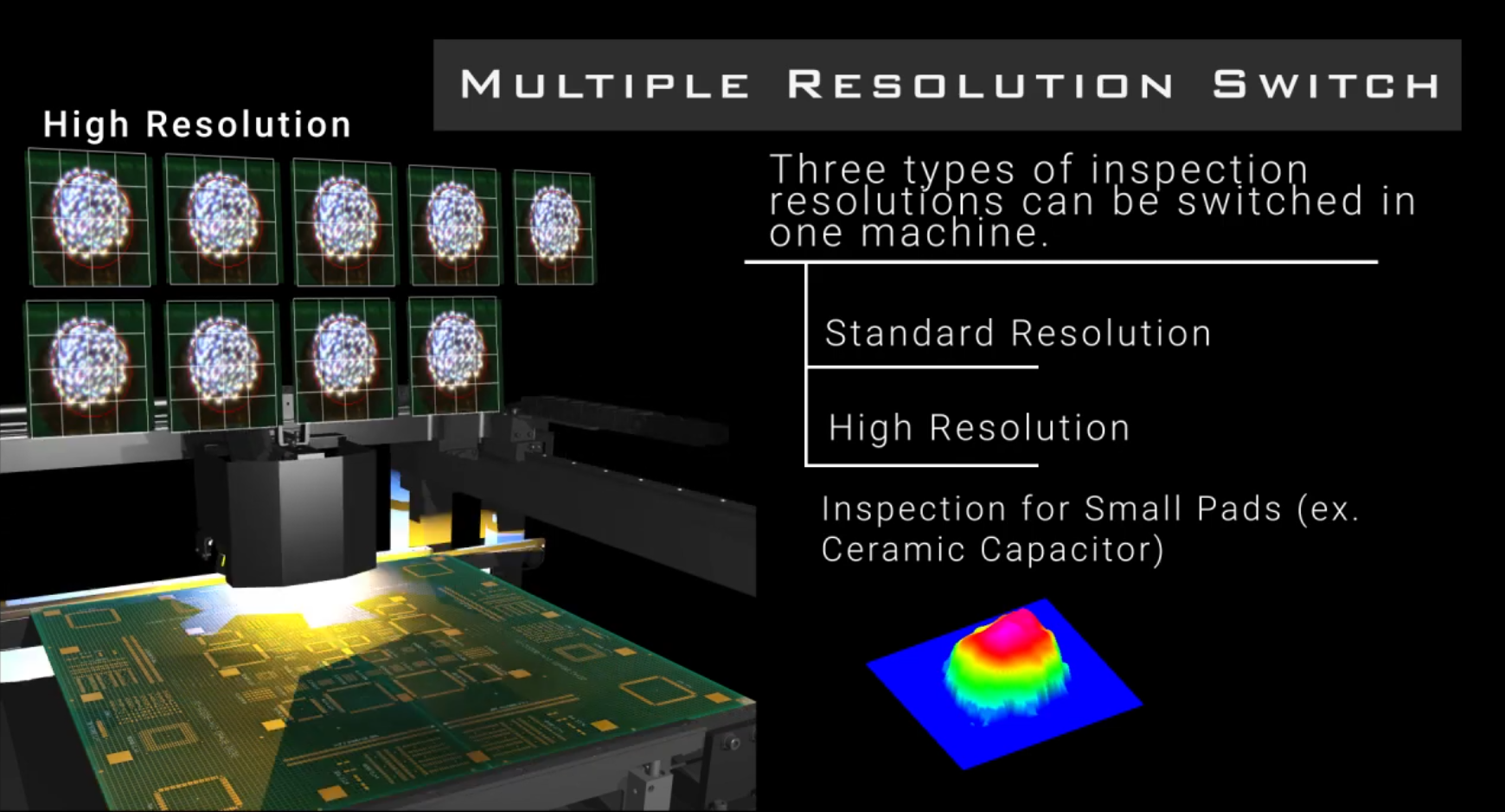 Ein weiteres Alleinstellungsmerkmal des Systems ist die Funktion „Multiple Resolution Switch“, mit der es automatisch und flexibel zwischen der Standard-Auflösung, einer hohen sowie einer sehr hohen Auflösung umgeschalten kann. Auf diese Weise kann in jedem Bereich der Leiterplatte jeweils der beste Kompromiss zwischen Inspektionsgeschwindigkeit und Inspektionsgenauigkeit eingestellt werden.