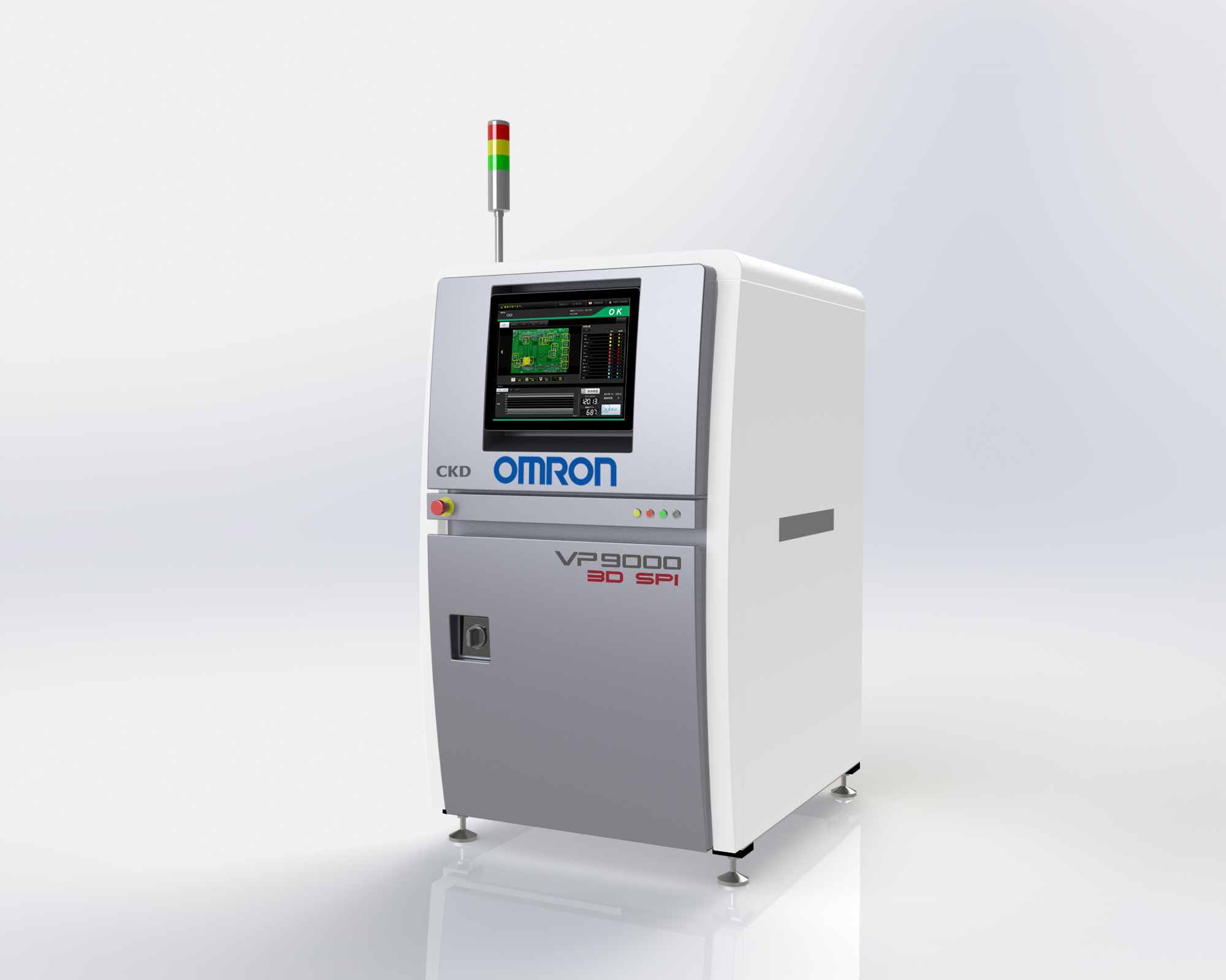 Das 3D-SPI-System (Solder Paste Inspection) CKD VP9000 von Omron ermöglicht eine zuverlässige und exakte 3D-Inspektion des Lotpastenauftrages auf Leiterplatten, wodurch Fehler und Abweichungen frühzeitig erkannt, der Druckprozess unter Kontrolle gehalten und die Qualität der nachfolgenden Produktionsschritte erhöht wird.