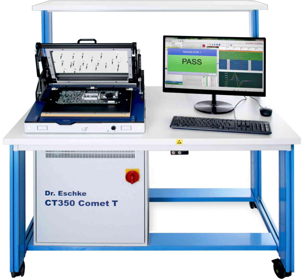 Die Tischversion der CT-350-Serie von Dr. Eschke lässt sich skalierbar als MDA-System, In-Circuit-Test (ICT)-, FKT- oder leistungsfähiger Kombinationstester konfigurieren und ist präzise auf jede Kundenanforderung abstimmbar. Als modulares und kompaktes ICT-System eignet sich das Gerät ideal sowohl für die Fertigung als auch für Entwicklung und Service. Die High-Pin-Count-Pylon-Schnittstelle begünstigt den schnellen Adapterwechsel und sorgt für eine zuverlässige Kontaktierung.
